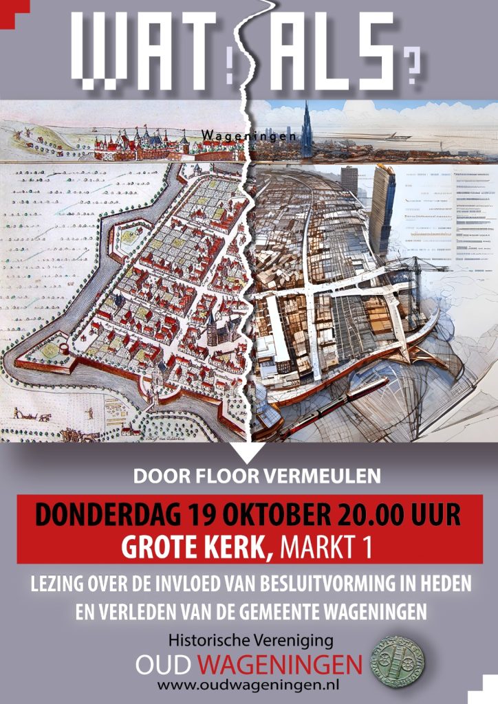 Op donderdag 19 oktober organiseert de Historische Vereniging Oud Wageningen (HVOW) haar afsluiting van het jubileumjaar 1973-2023, vijftig jaar HVOW. In de vorm van een lezing, die plaats zal vinden in de Grote Kerk op de markt in Wageningen. Bijzondere spreker is Floor Vermeulen, de burgemeester van Wageningen, het thema gaat over de impact van besluitvorming in het verleden op het heden. Wat als er anders besloten was? Over het uiterwaardenplan, over het station? Wie heeft er allemaal invloed gehad op deze besluitvorming? Kan er een parallel getrokken worden met huidige besluitvorming en de impact daarvan op de toekomst?