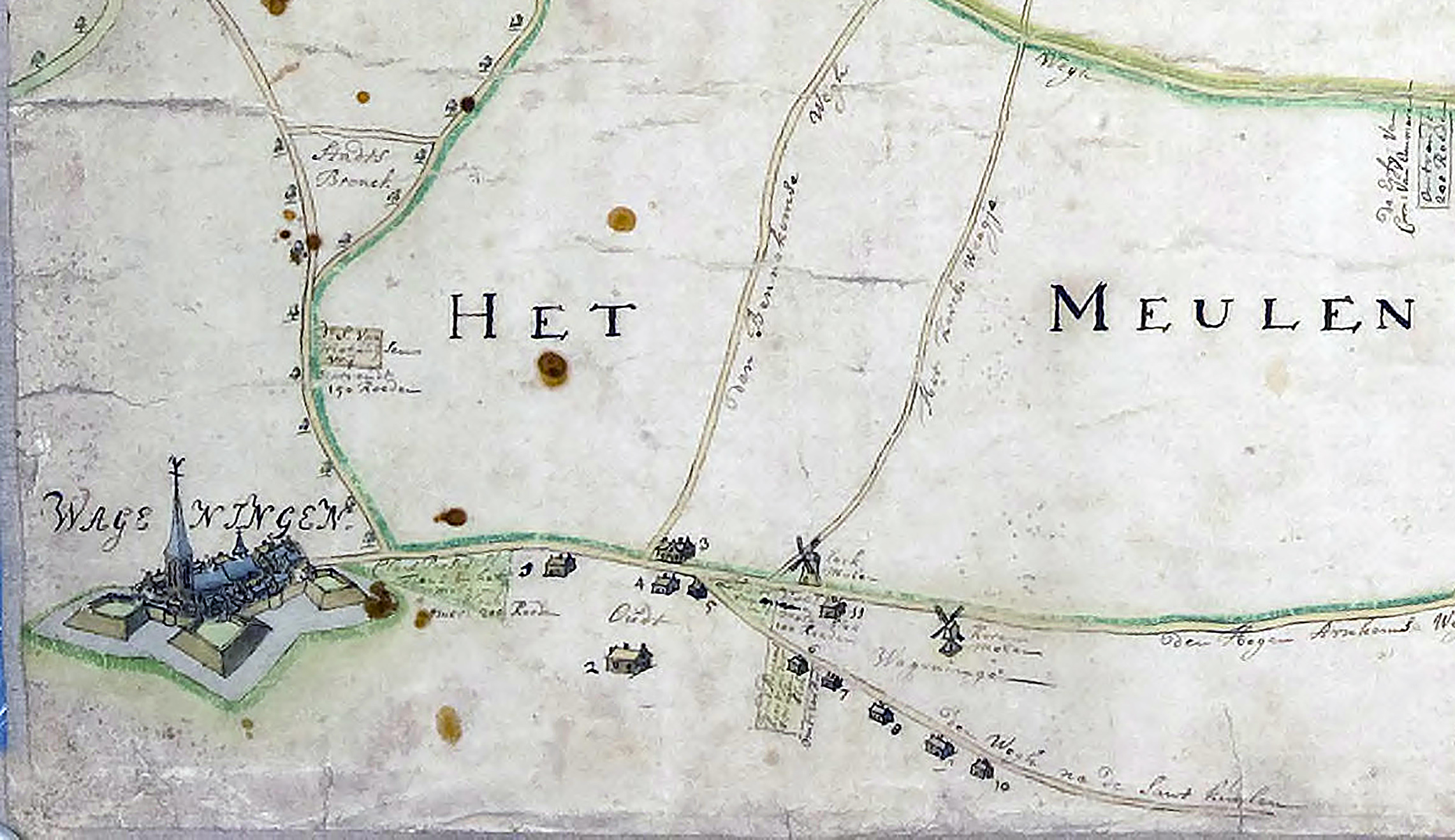 De vorige column toonde de 7 plaatsen waar ooit een rosmolen werkte in de binnenstad van Wageningen. Door de bescherming van de gracht met zijn stadsmuren was het hier een stuk veiliger voor zo een bedrijf, zodoende was het in vroegere eeuwen binnen de muren een stuk agrarischer. Dat is een verklaring van het grote aantal voor zo een tamelijk kleine binnenstad.