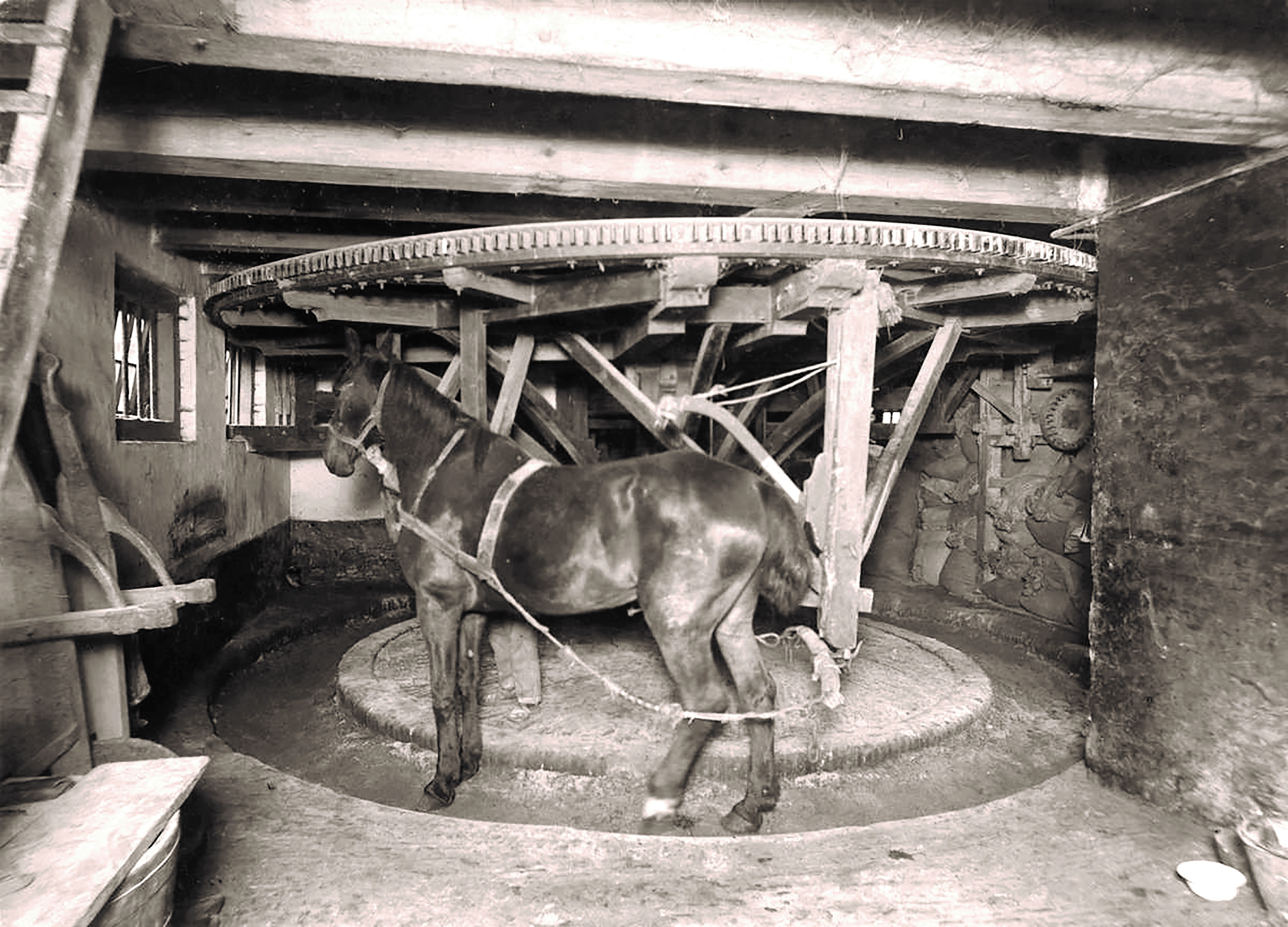 De paarden konden via de achteruitgang naar buiten. Het werk dat een paard te doen had was tamelijk eentonig, rondjes lopen en soms moesten er ook meerdere wielen aangedreven worden. Meestal was het maximaal een uur lopen. Soms gebruikte de mulder een grote zandloper die aangaf als het paard mocht stoppen. Er gaat een verhaal over een paard dat zelf stopte als de zandloper er door was: een paard dat kon klokkijken dus!! Om niet dol te worden liepen ze met blindlappen voor. Ook werd er een drollenzak onder de staart opgehangen om een schone vloer te houden.